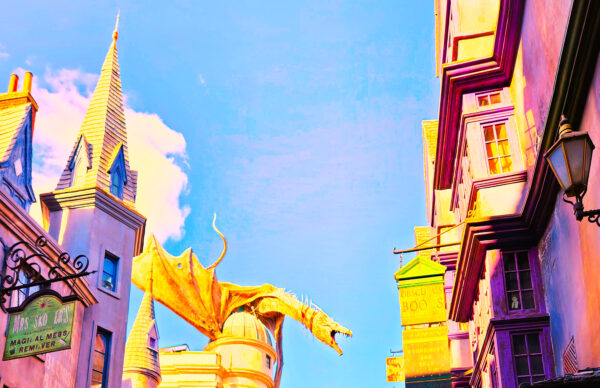 The surrounding buildings in diagon alley are steeped in old-world charm, with crooked facades, ornate trim, and sharply pitched rooftops that lean inward, creating a narrow, storybook-like alley. Warm sunlight washes over the architecture, intensifying hues of gold, amber, and magenta, while casting deep shadows that enhance the surreal, cinematic atmosphere.