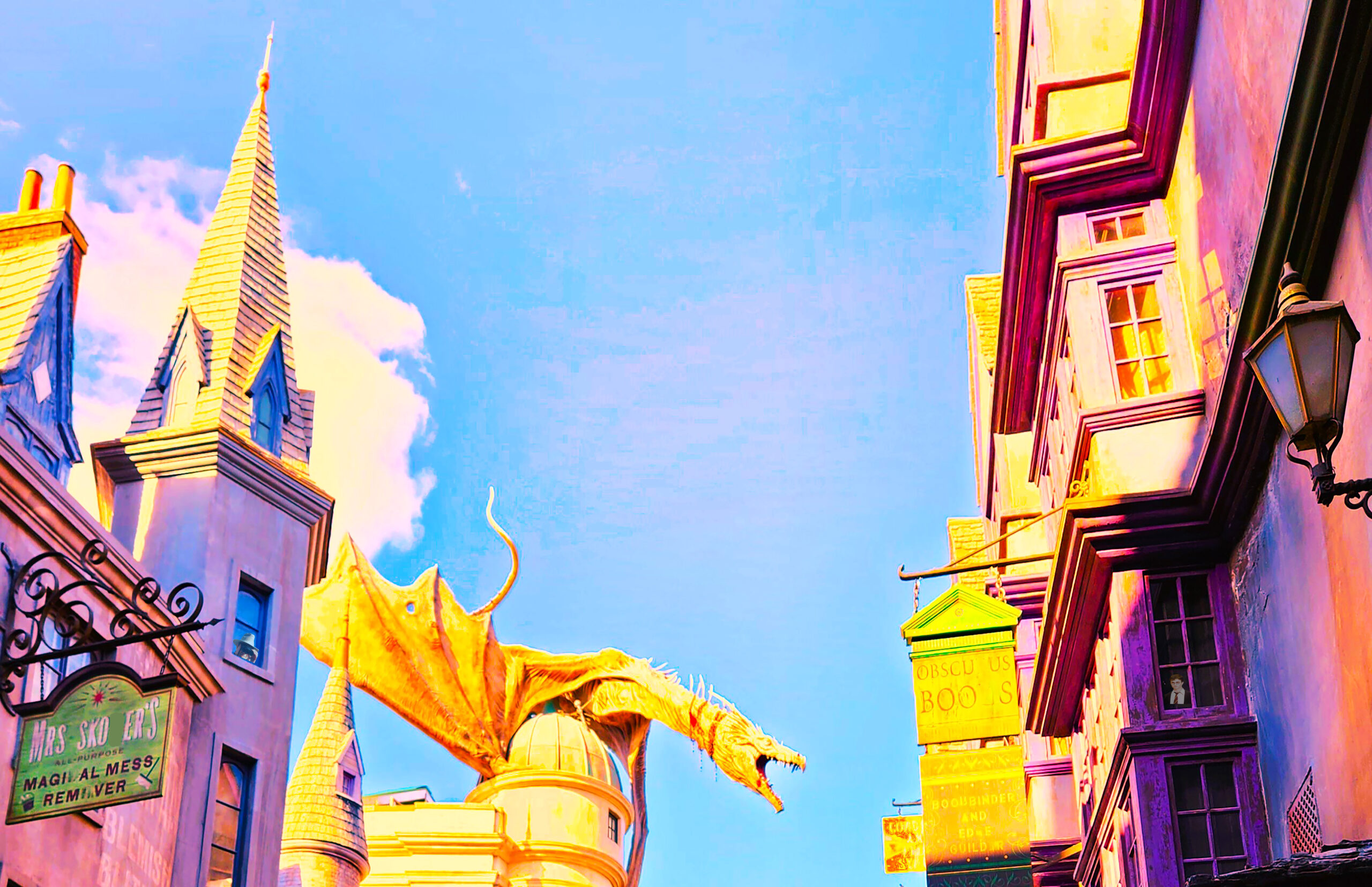 A dramatic, fantasy-infused streetscape unfolds beneath a vivid blue sky, where a massive golden dragon perches atop a domed gringotts bank rooftop, wings partially outstretched as if mid-guard or ready to take flight. Its elongated neck curves forward, jaws open in a silent roar, giving the scene a sense of tension and imminent action.