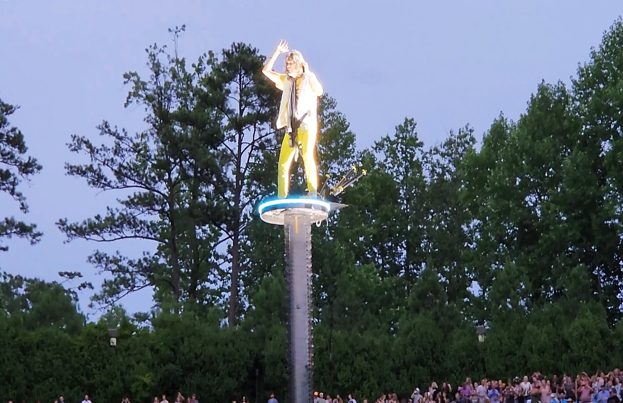 A rock band god or popular lead singer is elevated in the air, surrounded by trees and a concert crowd. The scene is a 2025 live public performance by Foreigner in Alpharetta, Georgia. The ViewFinder is watching.