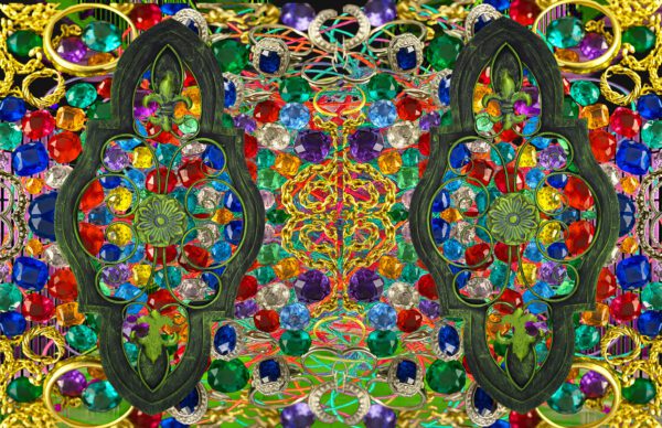 Intricate patterns of colorful gemstones contrast with ornate green metalwork in a symmetrical design. Various vibrant gems, including red, blue, and green, create a captivating kaleidoscope effect. This piece was inspired by stained glass windows during my recent visit to a Church. The ViewFinder Pirate is watching.