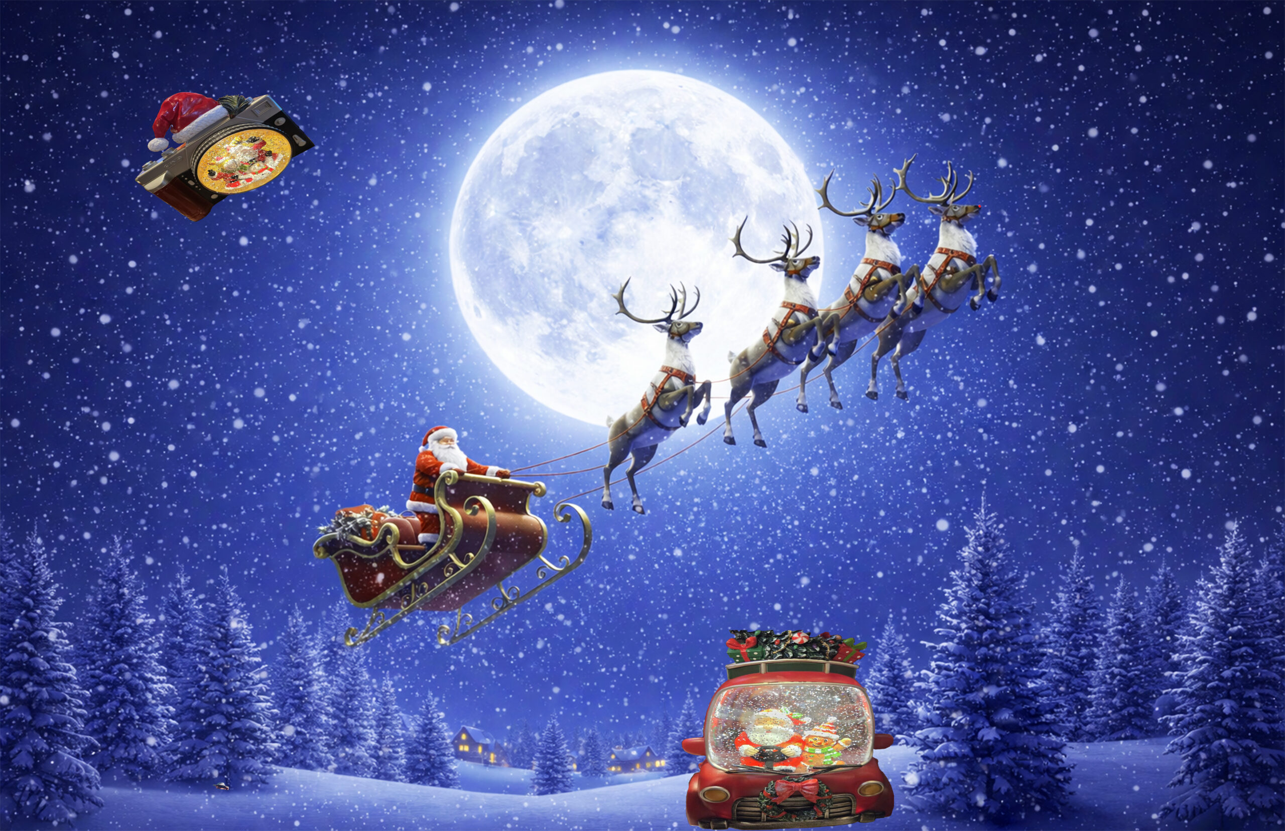 Santa Claus is seen in a sleigh led by reindeer and Rudolph, flying across a snowy landscape under a bright full moon. Snow-covered trees and distant houses add to the wintery scene. A sky camera is taking a picture of Santa with a snow globe bus driving below in the snow. The ViewFinder is watching.