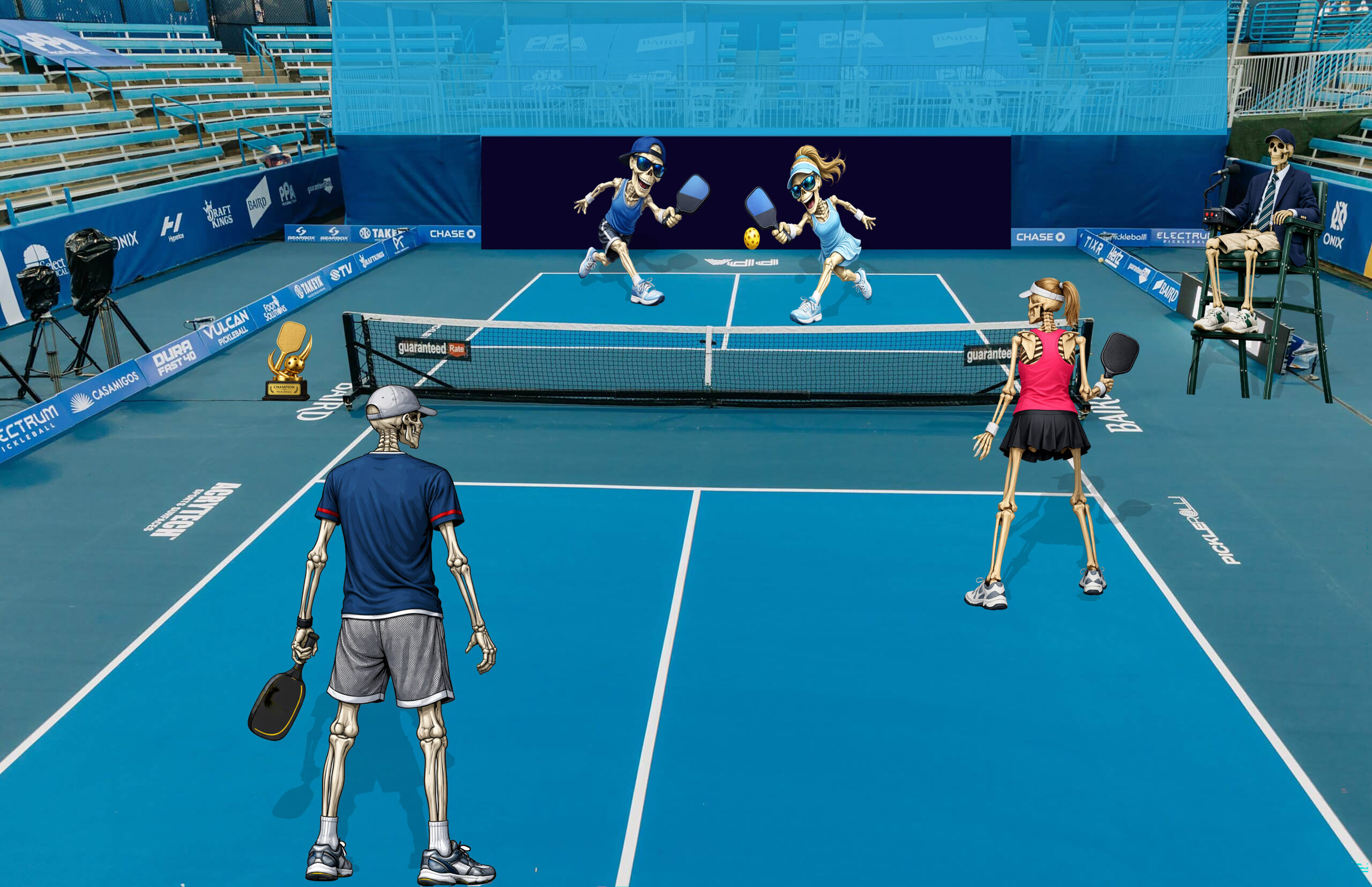 This image is a surreal, humorous take on a professional pickleball match reimagined entirely with skeleton players. An intriguing pickleball match takes place between skeleton players on a vibrant blue court. The skeleton umpire monitors the match and the trophy awaits. The animated characters display dynamic movements, adding a futuristic touch. Overall, the image feels like a whimsical afterlife championship match, combining athletic competition with a creative, tongue-in-cheek visual concept. The ViewFinder is watching.