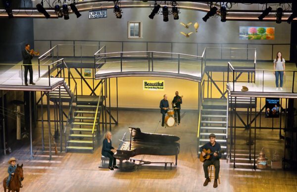 In an interior setting featuring a multi-level stage, musicians play various instruments including a trumpet, piano, drums and guitar. Find the 12 icons that represent their famous song lyrics. Although they did not write songs together, they did perform each others songs together. This stage was actually used for a rendition of the Beautiful Musical. The ViewFinder is watching.
