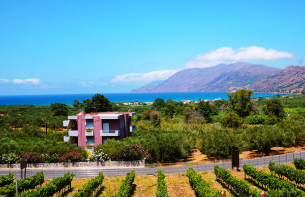 A scenic landscape view from a Greek Winery featuring a vineyard in the foreground and the distant blue Aegean Sea. The rolling hills and mountains of the Crete Island enhance the picturesque view. The ViewFinder is watching.